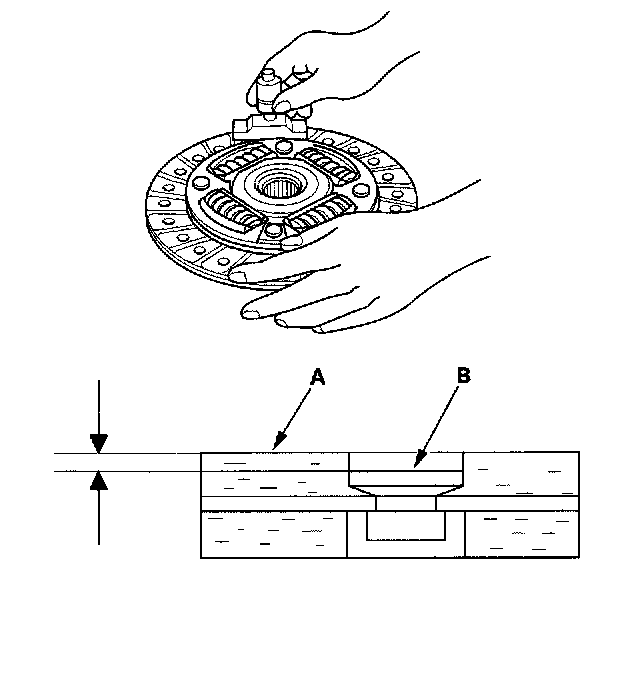 Measure the rivet depth from the clutch disc lining surface (A) to the rivets (B) on both sides. If the rivet depth is less than the service limit, replace the clutch disc.