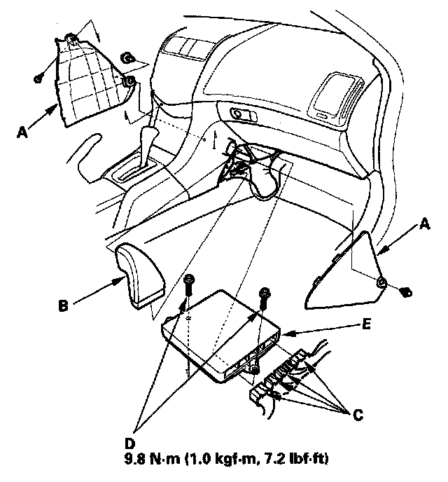 15. Remove the bolts (D), then remove the ECM/PCM (E).