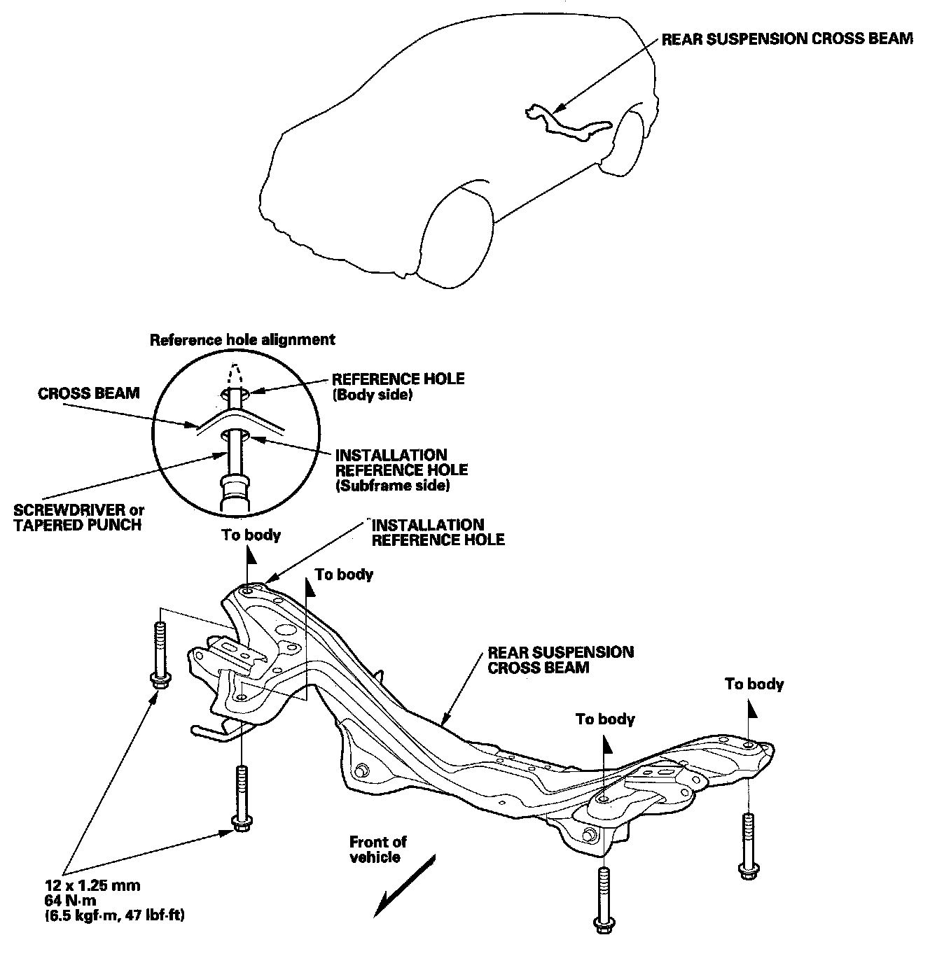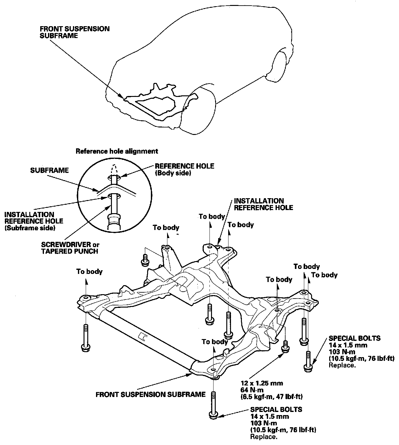 - When installing, align both installation reference holes in the subframe with both reference holes in the body using a screwdriver or tapered punch as a guide.
