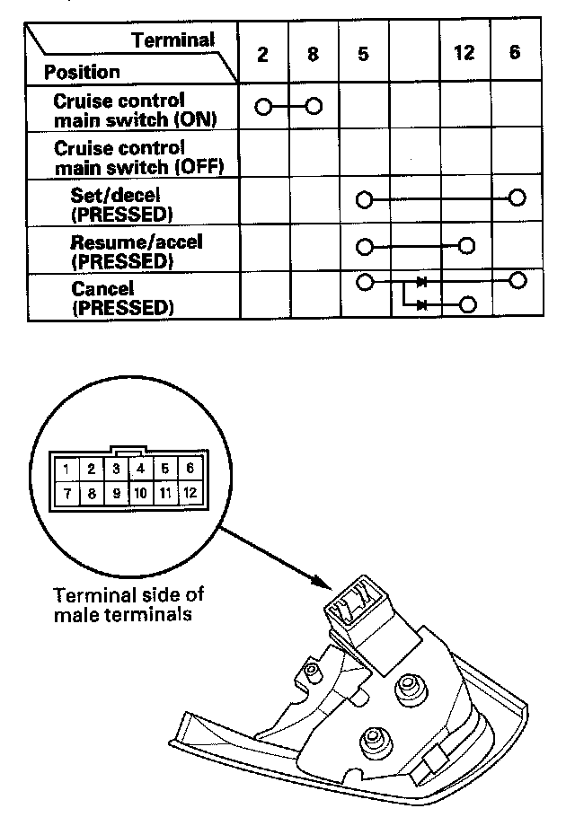 - If there is continuity, and it matches the table, but switch failure occurred on the cruise control input test, check and repair the wire harness on the switch circuit.