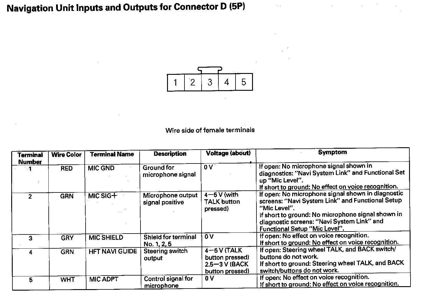 Navigation Unit Inputs And Outputs For Connector D (5P):