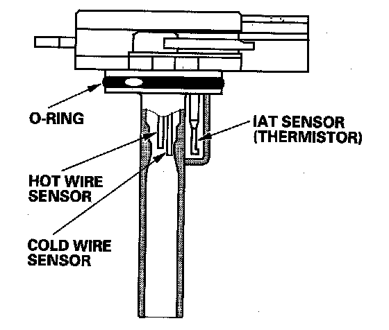 The mass air flow (MAF) sensor/intake air temperature (IAT) sensor contains a hot wire and a thermistor. It is located in the intake air passage. The resistance of the hot wire and thermistor changes due to intake air temperature and air flow. The control circuit in the MAF sensor controls the current to keep the hot wire at a set temperature. The current is converted to voltage in the control circuit, then output to the PCM.