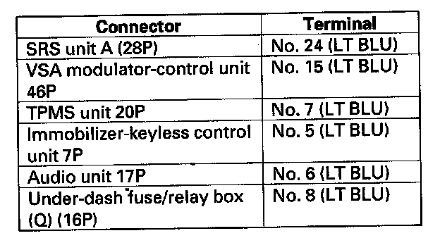 NO - Repair short in the wire between the DLC (K-line) and the VSA modulator-control unit, the SRS unit, the TPMS unit, the immobilizer-keyless control unit, the audio unit, or the under-dash fuse/relay box.