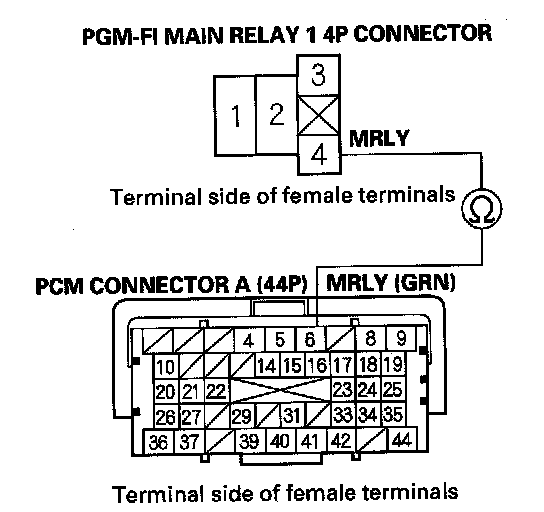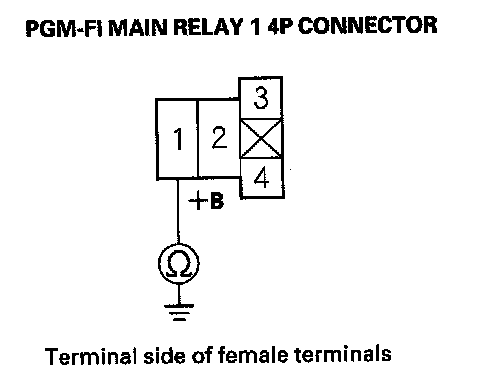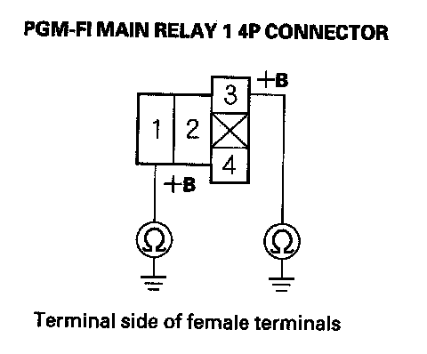 44. Check for continuity between PGM-FI main relay 1 4P connector terminal No. 2 and body ground.