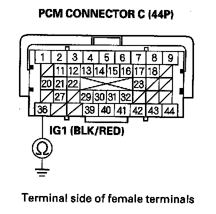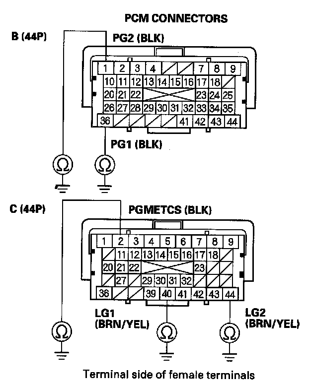 73. Check for continuity between body ground and PCM connector terminals B1, B36, C2, C40, and C44 individually.