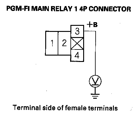 65. Measure voltage between PGM-FI main relay 1 4P connector terminal No. 3 and body ground.
