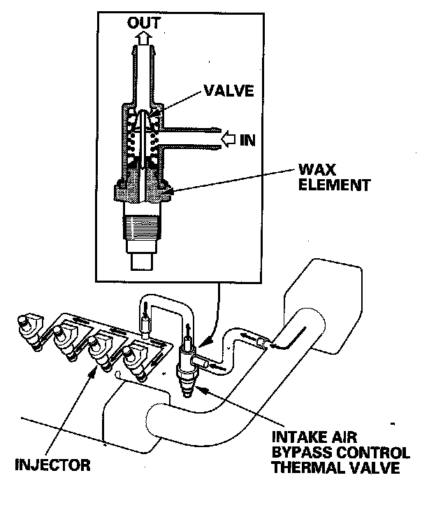 When the engine is cold, the intake air bypass control thermal valve sends air to the injector. The amount of air is regulated by engine coolant temperature. Once the engine is hot, the intake air bypass control thermal valve closes, stopping air to the injector.