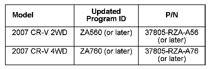 The updated PGM-FI software program IDs and P/Ns are shown below. If one of these, ora later program ID, is the current Program ID displayed during the update, the software for this service bulletin is already installed.