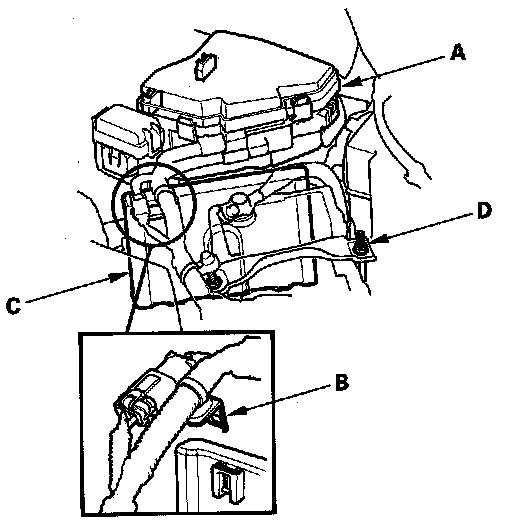 8. Loosen the battery hold down bolt (D) and re-position the battery away from the PCM.