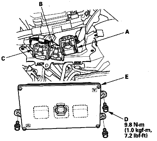NOTE: PCM connectors A, B, and C have symbols (A=[], B=/\, C=0) embossed on them for identification.
