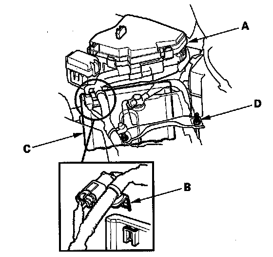 13. Loosen the battery hold down belt (D) and re-position the battery away from the PCM.