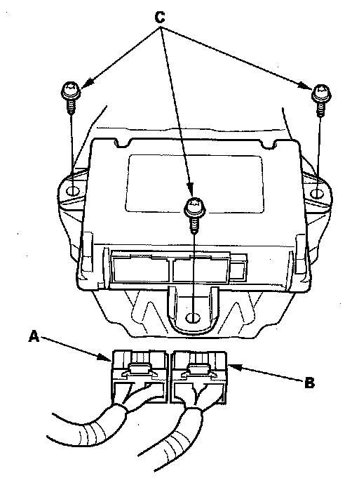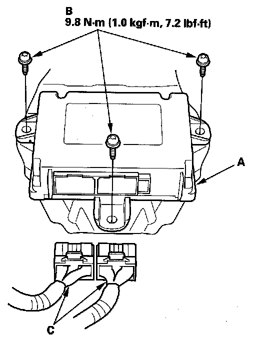 1. Install the new SRS unit (A) with new TORX bolts (B), then connect the connectors (C) to the SRS unit; push them into position until they click.