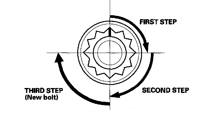 After torquing, tighten all cylinder head bolts in two steps (90° per step). If you are using a new cylinder head bolt, tighten the bolt an extra 90°.