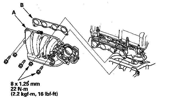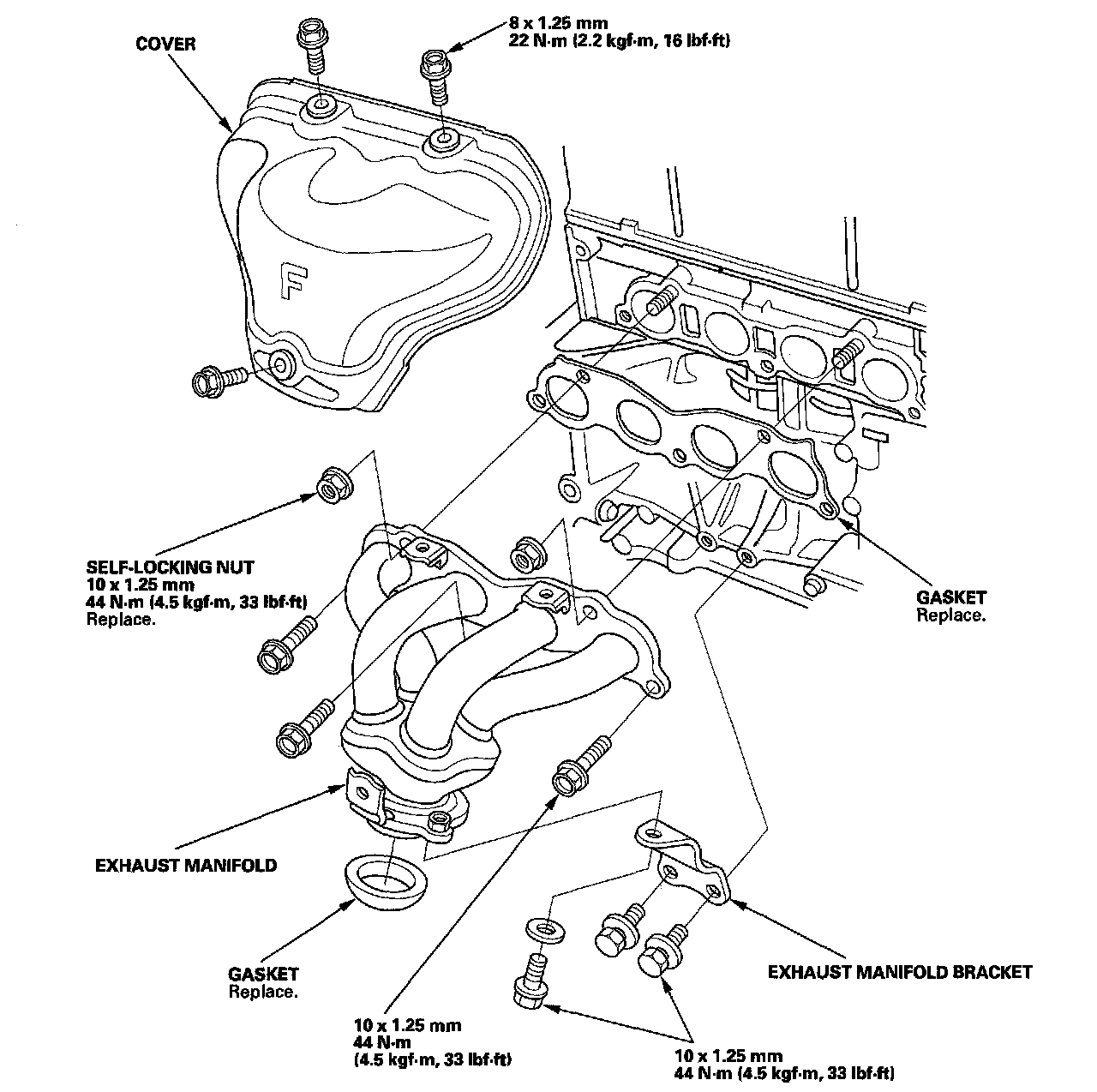 Install the exhaust manifold, and tighten the bolts and nuts in a crisscross pattern in two or three steps, beginning with the inner nut.