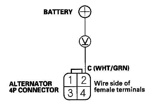 7. Measure the voltage between alternator 4P connector terminal No. 2 and the positive terminal of the battery.