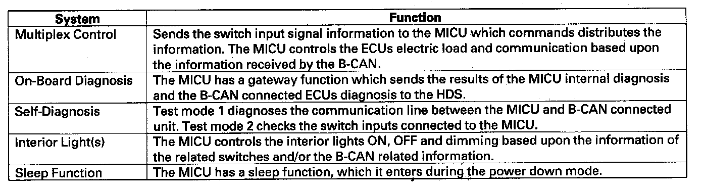 The MICU (built into the under-dash fuse/relay box) is one of the B-CAN components. The MICU controls many systems related to the body controller area network, and also works as a gateway to diagnose the other B-CAN circuits with the HDS.