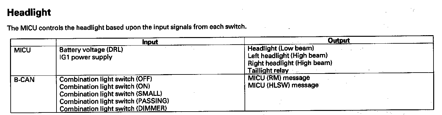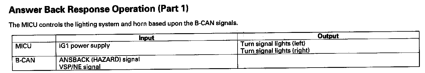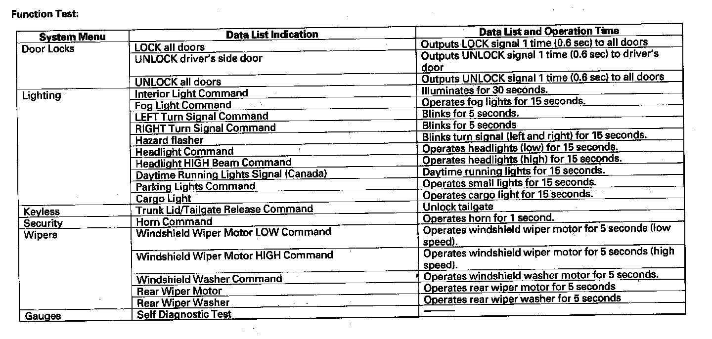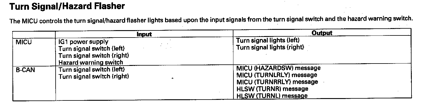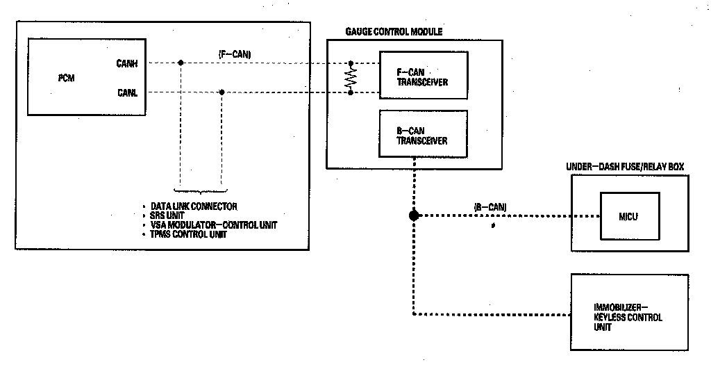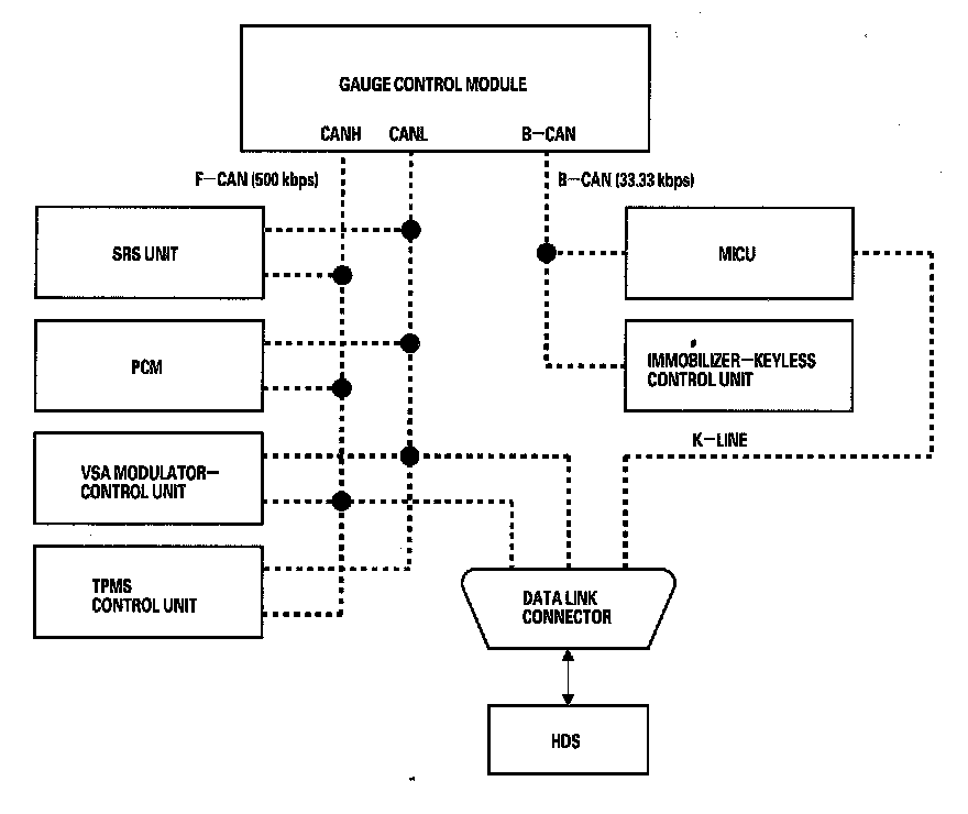 By connecting the HDS to the data link connector (DLC), the HDS can retrieve the diagnostic results from the MICU via a diagnostic line called K-LINE. The K-LINE is distinguished from the CAN line, and connected to the CAN related ECUs. The MICU is a gateway between the HDS and B-CAN related ECUs, and sends B-CAN diagnostic results to the HDS. When performing a function test with the HDS, the HDS sends an output signal through the K-LINE to the MICU. The MICU either relays the request to another ECU, or commands the function its self.