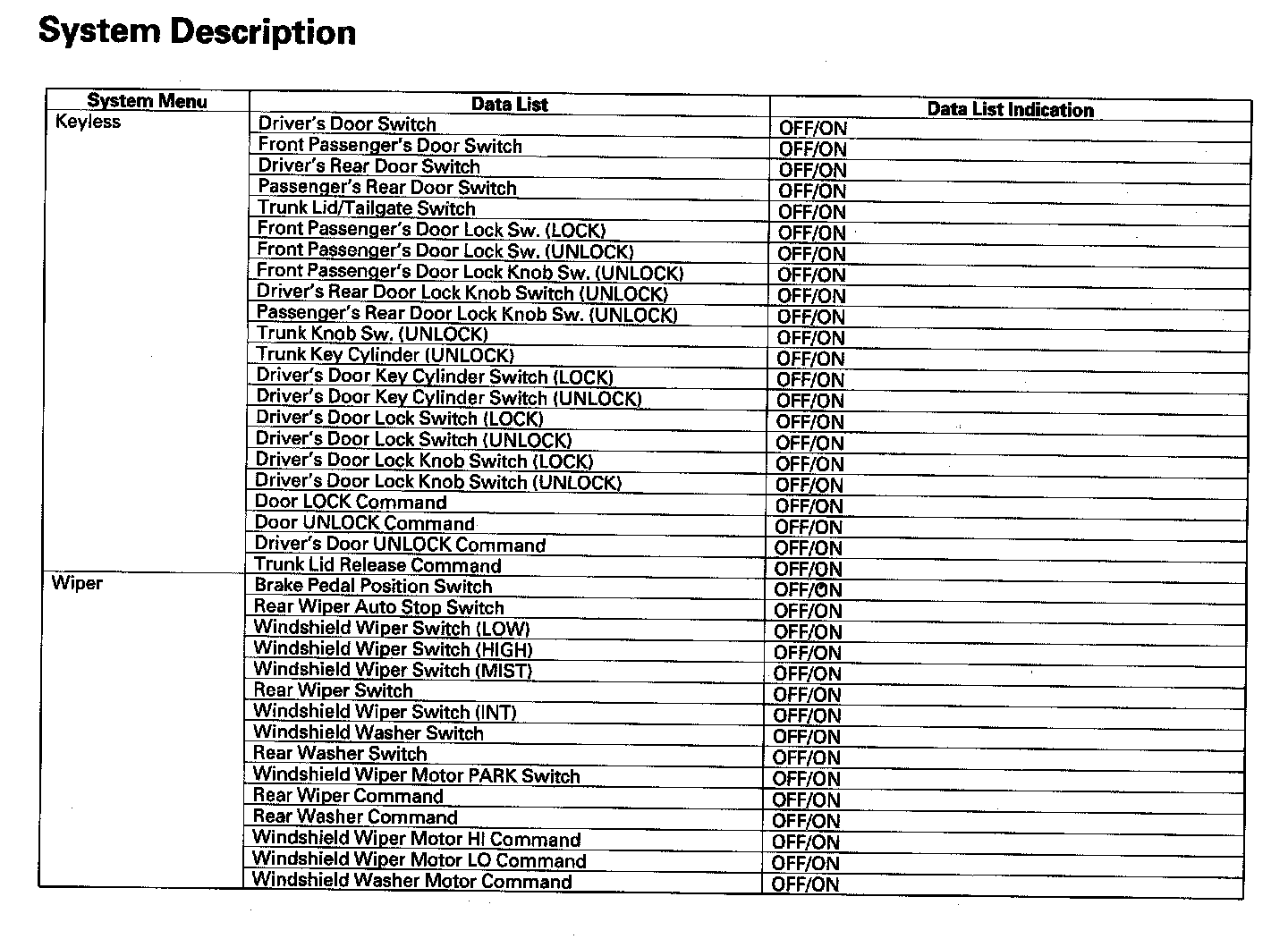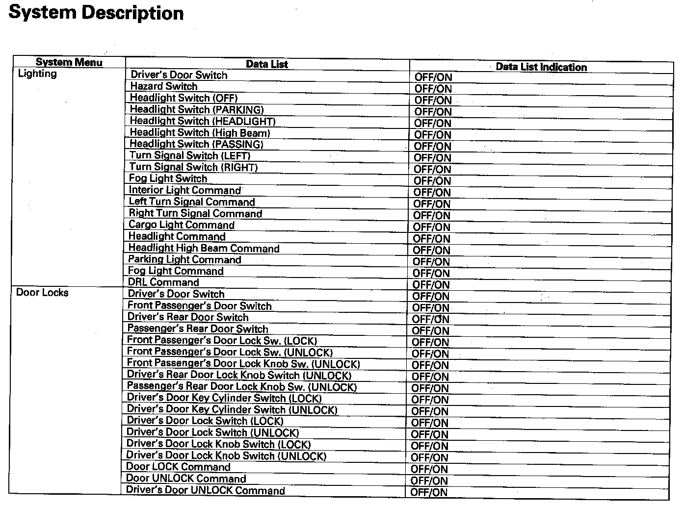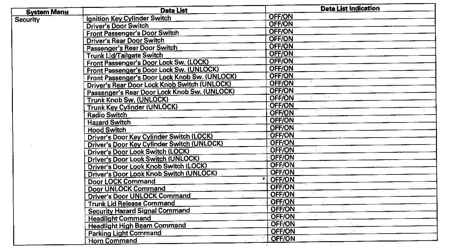 By connecting the HDS to the data link connector (DLC), the HDS can retrieve the diagnostic results from the MICU via a diagnostic line called K-LINE. The K-LINE is distinguished from the CAN line, and connected to the CAN related ECUs. The MICU is a gateway between the HDS and B-CAN related ECUs, and sends B-CAN diagnostic results to the HDS. When performing a function test with the HDS, the HDS sends an output signal through the K-LINE to the MICU. The MICU either relays the request to another ECU, or commands the function its self.