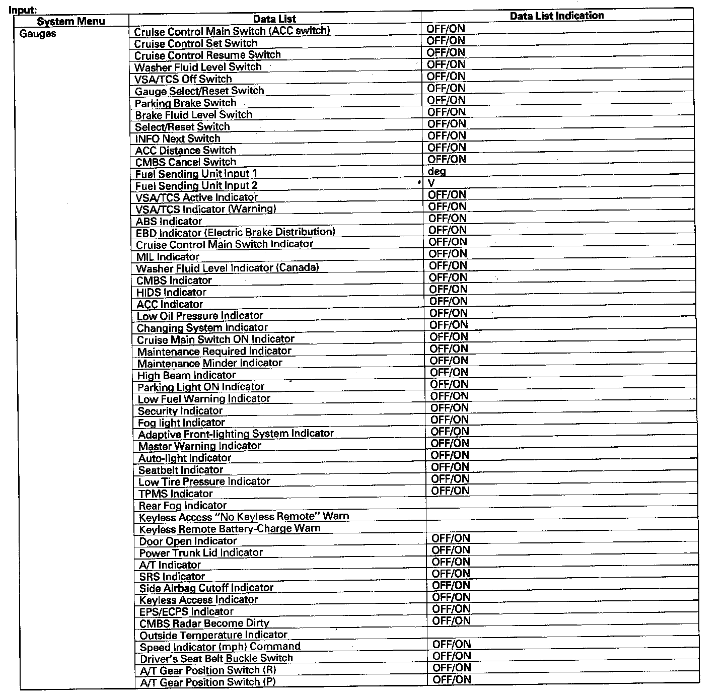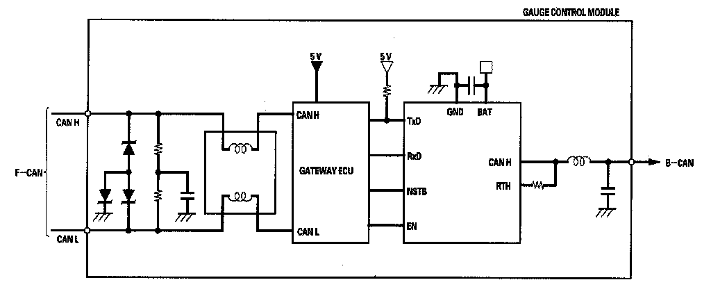 The body controller area network (B-CAN) and the fast controller area network(F-CAN) share information between multiple electronic control units (ECUs). B-CAN communication moves at a slower speed (33.33 kbps) for convenience related items and for other functions. F-CAN information moves at a faster speed (500 kbps) for "real time" functions such as fuel and emissions data To allow both systems to share information, the gauge control module translates information from B-CAN to F-CAN and from F-CAN to B-CAN.