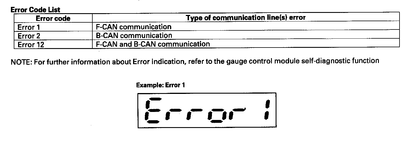 The ECUs on the CAN circuit send messages to each other. If there are any malfunctions on the network, the odo/trip display on the gauge control module can indicate the error messages by entering the gauge self-diagnostic function.