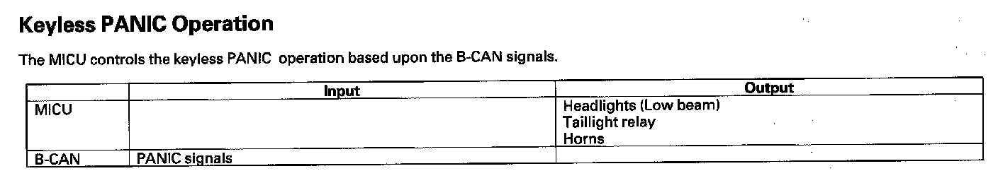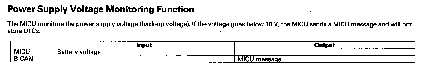 When any of the data from the B-CAN circuit cannot be received within a specified time, or an unusual combination of the data is recognized, the MICU moves to the software fail-safe mode. The data that cannot be received is forced to a pre-programmed value.