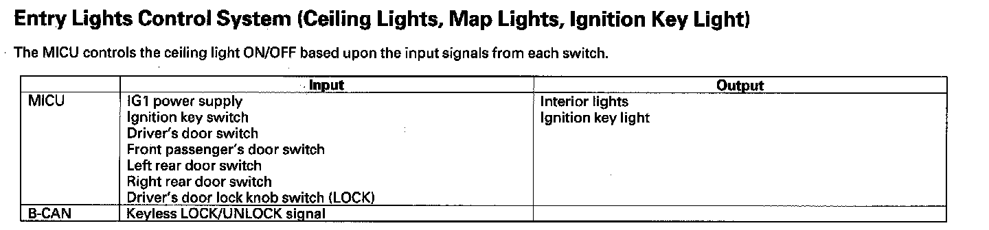 Entry Lights Control System (Ceiling Lights, Map Lights, Ignition Key Light)