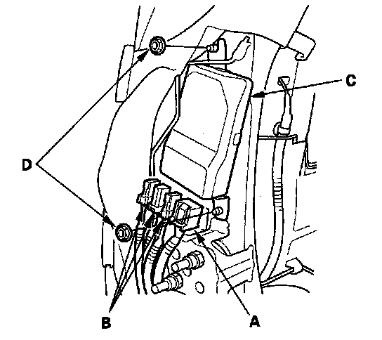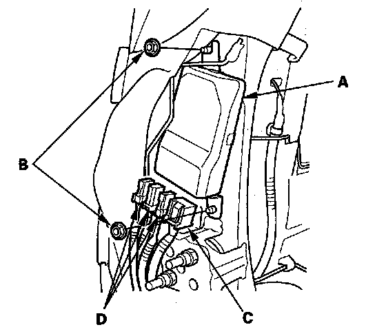 1. Place the new ODS unit (A) on the seat-back frame. Tighten the two nuts (B), and connect the ODS unit 18P connector (C) and sensor connectors (D) to the ODS unit.