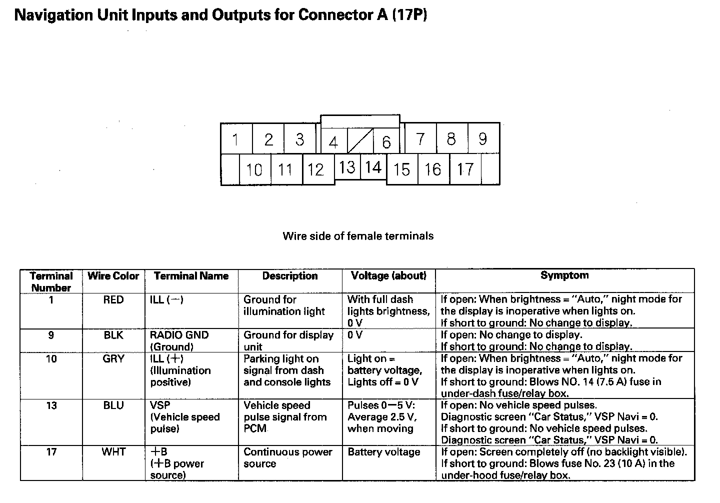 Navigation Unit Inputs And Outputs For Connector A (17P):