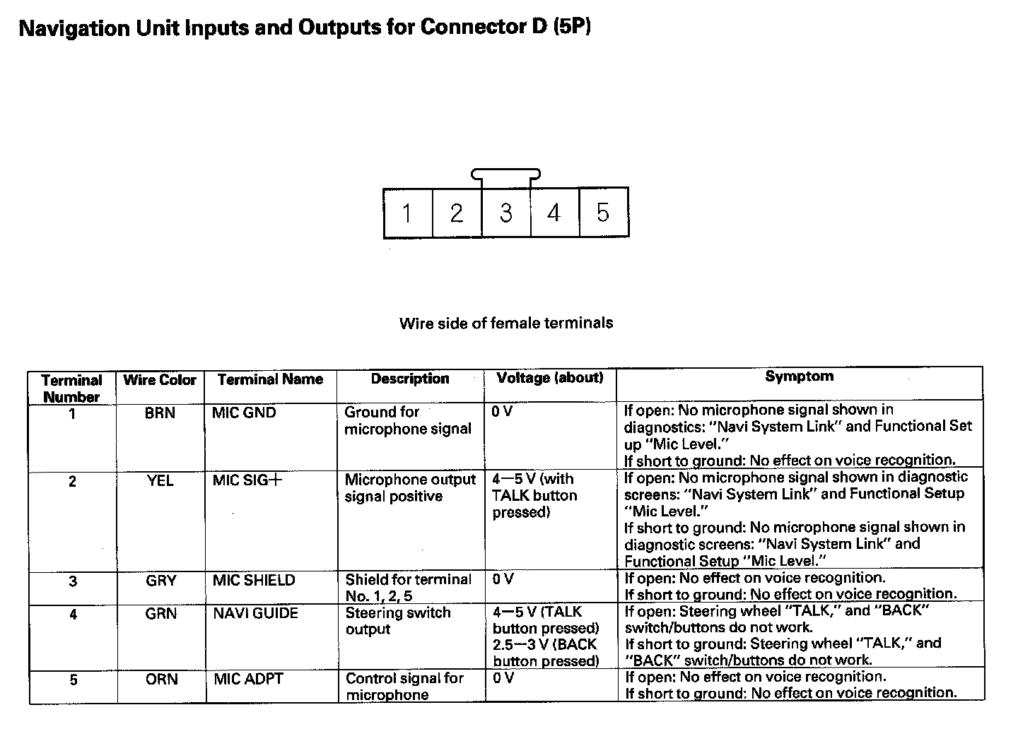Navigation Unit Inputs And Outputs For Connector D (5P):