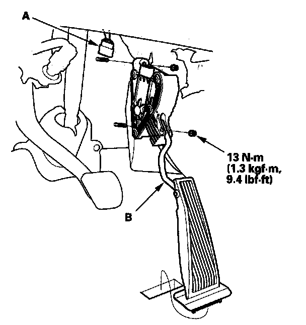 2. Remove the accelerator pedal module (B).