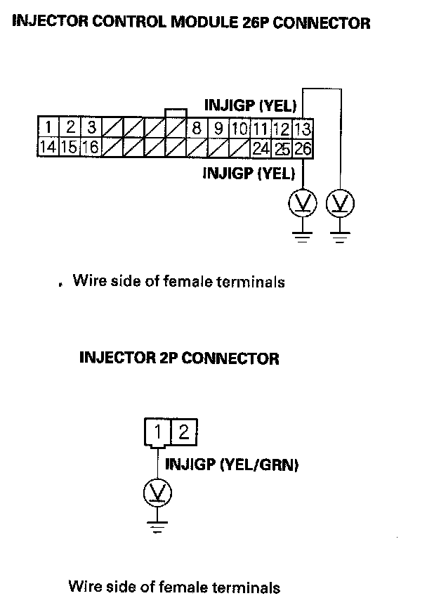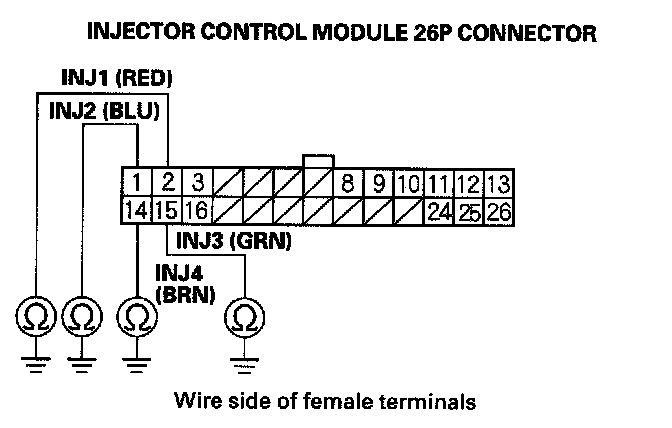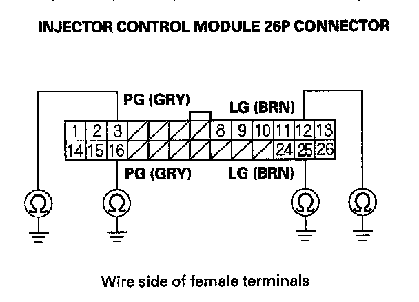 13. Check for continuity between body ground and injector control module 26P connector terminals No. 3, No. 12, No. 16, and No. 25 individually.