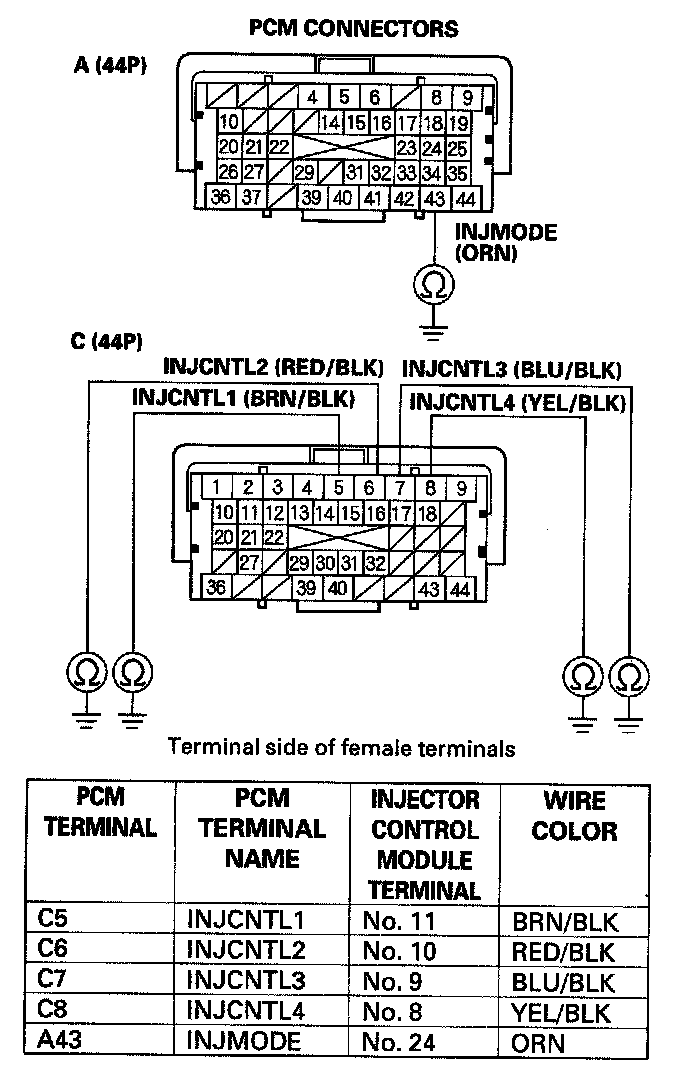 9. Check for continuity between body ground and the PCM connector terminals (see table).