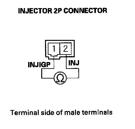 21. At injector side, measure resistance between injector 2P connector terminals No. 1 and No. 2.