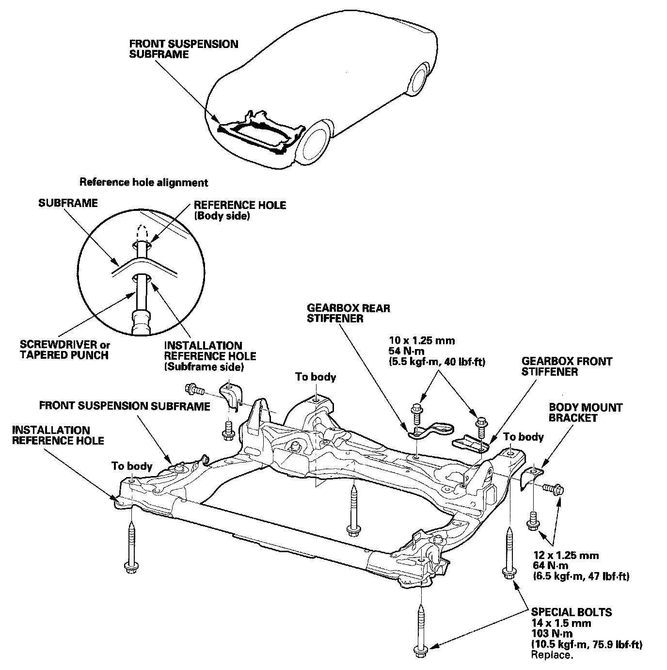 - After loosening the subframe mounting bolts, be sure to replace them with new ones.