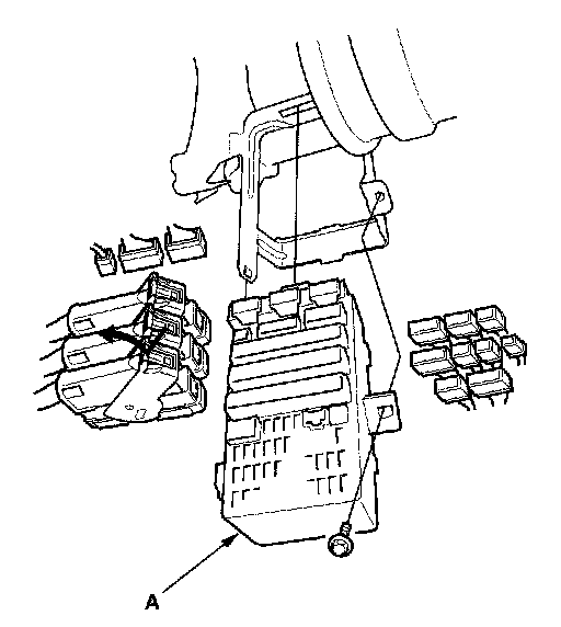 5. Disconnect the connectors from the fuse side of the under-dash fuse/relay box (A).