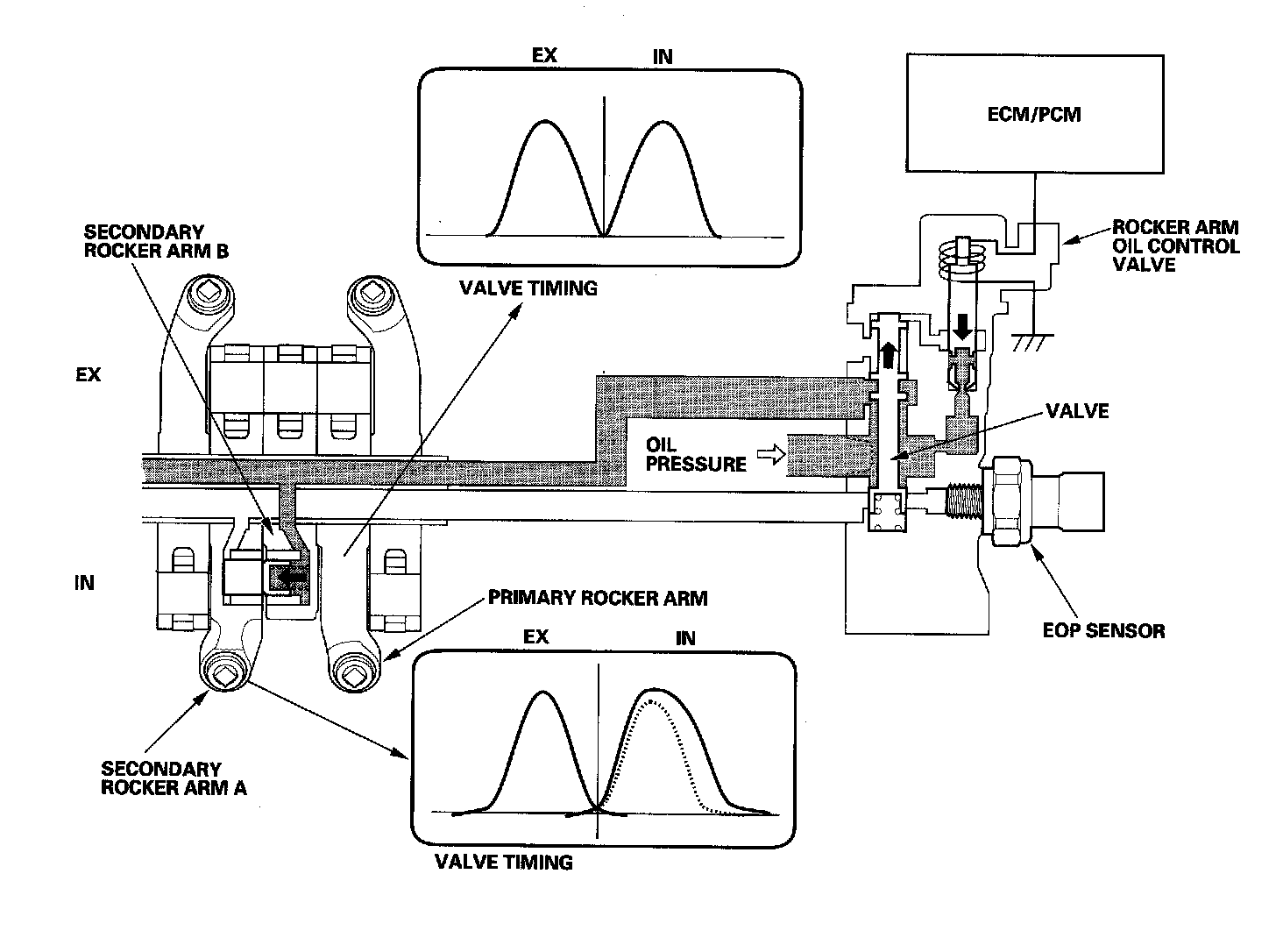 This forces the VTEC switching piston into secondary rocker arm A against the return spring and disengages the secondary arm A from the secondary arm B to stop valve actuation.