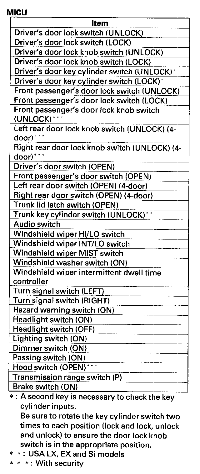 11. The given tables list the circuits that can be checked in Test Mode 2. Operate the switch that is most closely related to the problem. If the circuit is OK, the ceiling light will blink once. If the circuit is faulty, there will be no indication.