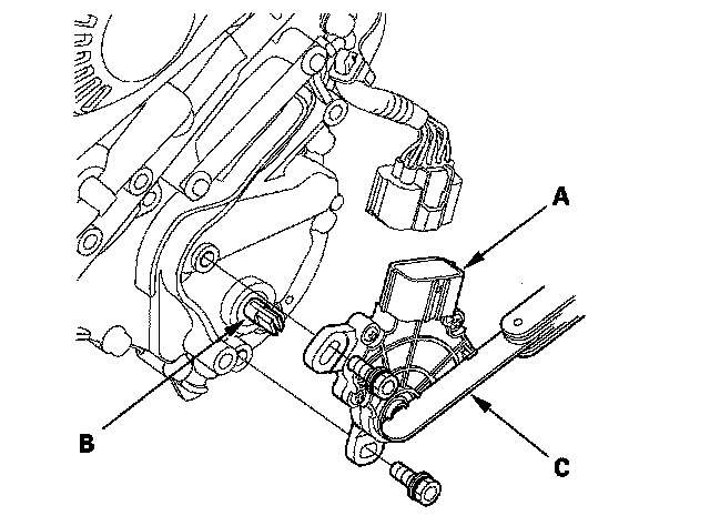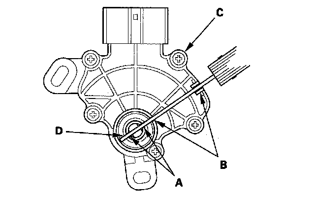 6. Align the cutouts (A) on the rotary-frame with the neutral positioning cutouts (B) on the transmission range switch (C), then put a 2.0 mm (0.08 in.) feeler gauge blade (D) in the cutouts to hold the switch in the N position.