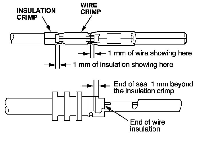 3. Strip the insulation off the end of the wire so the wire fits in the new terminal as shown. (If the wire has a wire seal, replace it with a new one from the kit.)