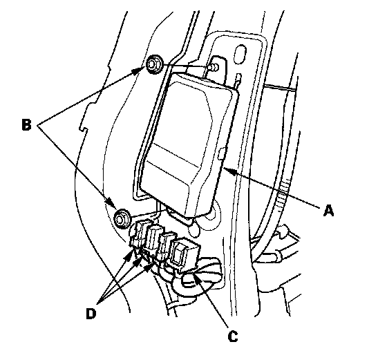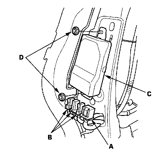 1. Place the new ODS unit (A) on the seat-back frame. Tighten the two nuts (B), and connect the ODS unit harness 18P connector (C) and sensor connectors (D) to the ODS unit.
