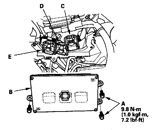 10. Remove the bolts (A), and remove the PCM (B).
