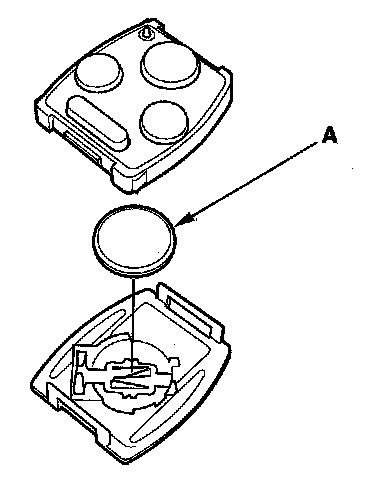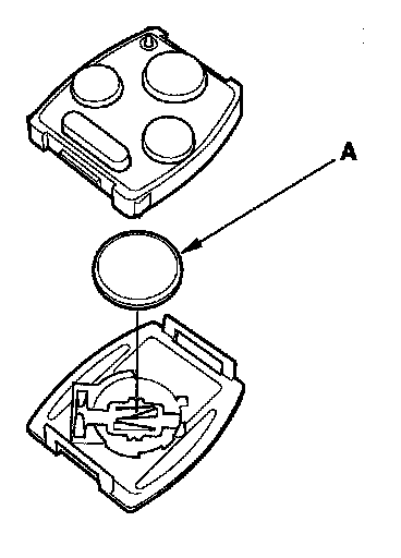 4. Replace the transmitter battery (A) with a new one, and try to lock and unlock the doors with the transmitter by pressing the lock or unlock button five or six times.