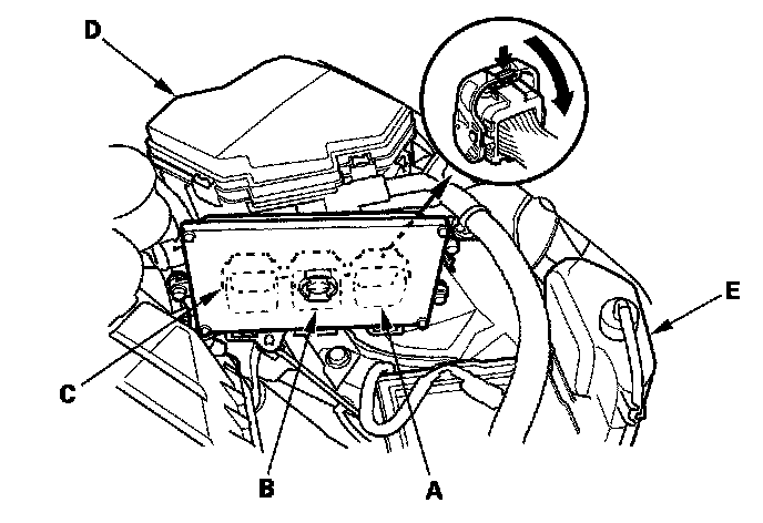 4. Remove the coolant reservoir (E). Disconnect the ECM connectors A, B, and C.