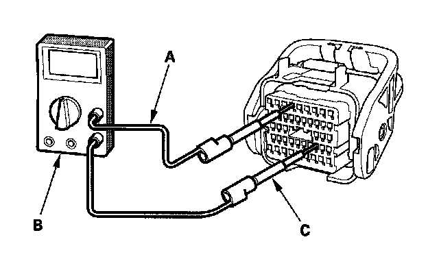 6. Connect one side of the patch cord (A) terminals to a commercially available digital multimeter (B), and connect the other side of the patch cord terminals to a commercially available banana jack (Pomona Electronics Tool No.3563 or equivalent) (C).