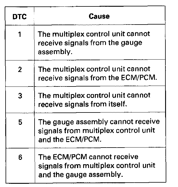 - DTC 2 and 5 simultaneously: Check for an open in the YEL wire between multiplex control unit terminal E10 and ECM/PCM terminal E13, If the wire is OK, substitute a known-good multiplex control unit, gauge assembly, and ECM/PCM one at a time, in that order, and recheck for the DTCs after each substitution.