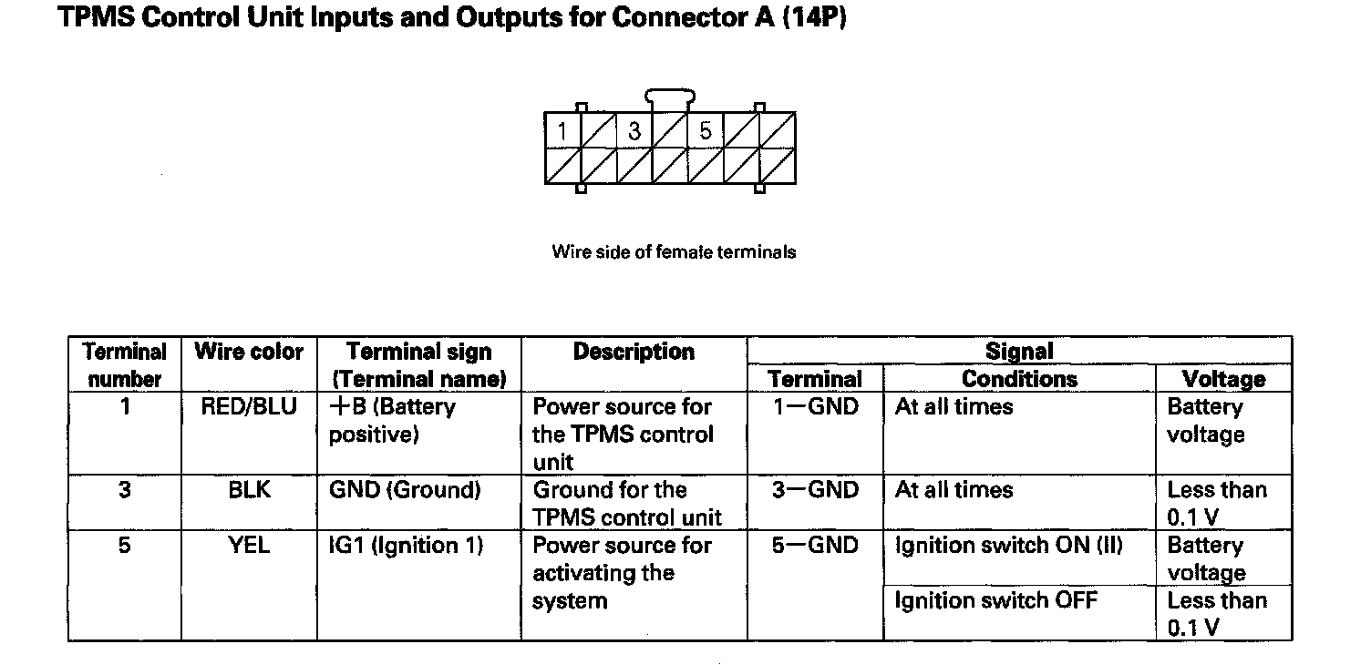TPMS Control Unit Inputs and Outputs for Connector A (14P):