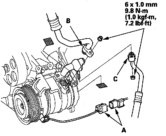 10. Disconnect the A/C compressor clutch connector (A), remove the nuts, then disconnect the suction line (B) and the discharge line (C) from the A/C compressor. Plug or cap the lines immediately after disconnecting them to avoid moisture and dust contamination.