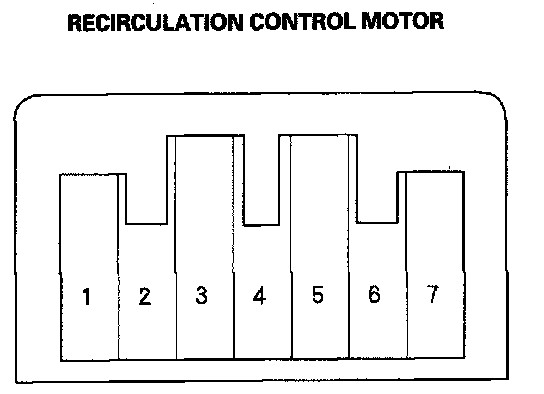 2. Connect battery power to the No. 1 terminal of the recirculation control motor, and ground the No. 5 and No. 7 terminals; the recirculation control motor should run smoothly. To avoid damaging the recirculation control motor, do not reverse power and ground. Disconnect the No. 5 or No. 7 terminals from ground; the recirculation control motor should stop at Fresh or Recirculate. Don't cycle the recirculation control motor for a long time.