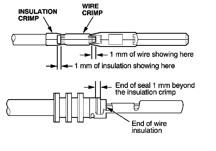 3. Strip the insulation off the end of the wire so the wire fits in the new terminal as shown. (If the wire has a wire seal, replace it with a new one from the kit.)