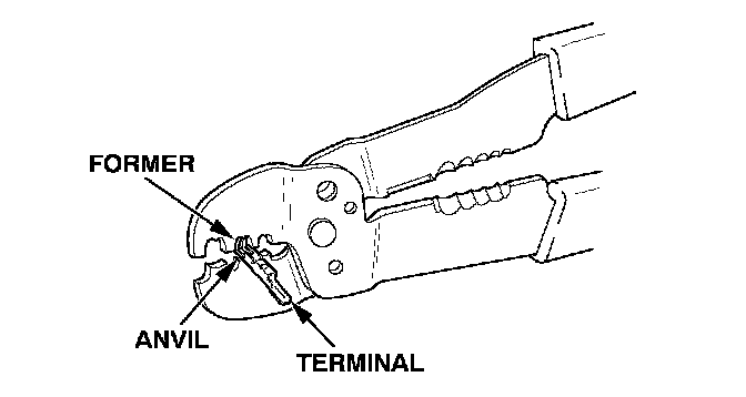 4. Position the terminal in the crimping tool slot with the solid portion of the terminal toward the anvil and the open section toward the former.
